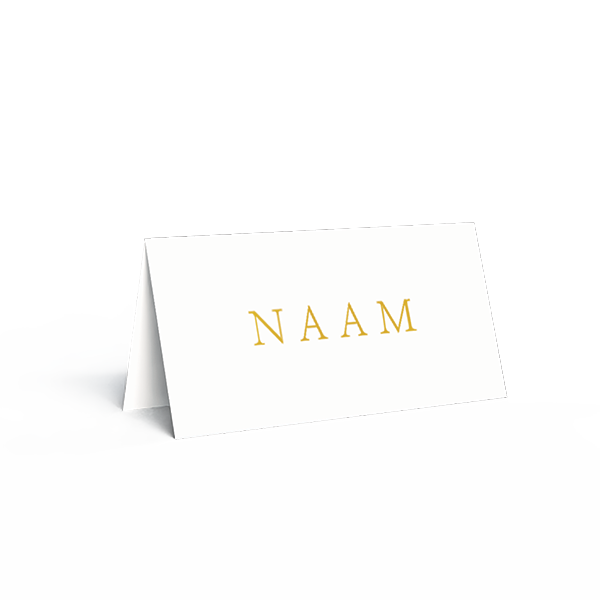 Bestel naamkaartjes om jullie tafelstyling compleet te maken. Dit zijn dubbelgevouwen naamkaartjes die je handig op tafel neerzet. Voeg op de achterkant de illustratie toe die overeenkomt met de tafelnummerkaart en het tafelschikkingbord. De namen worden in goudfolie gedrukt.