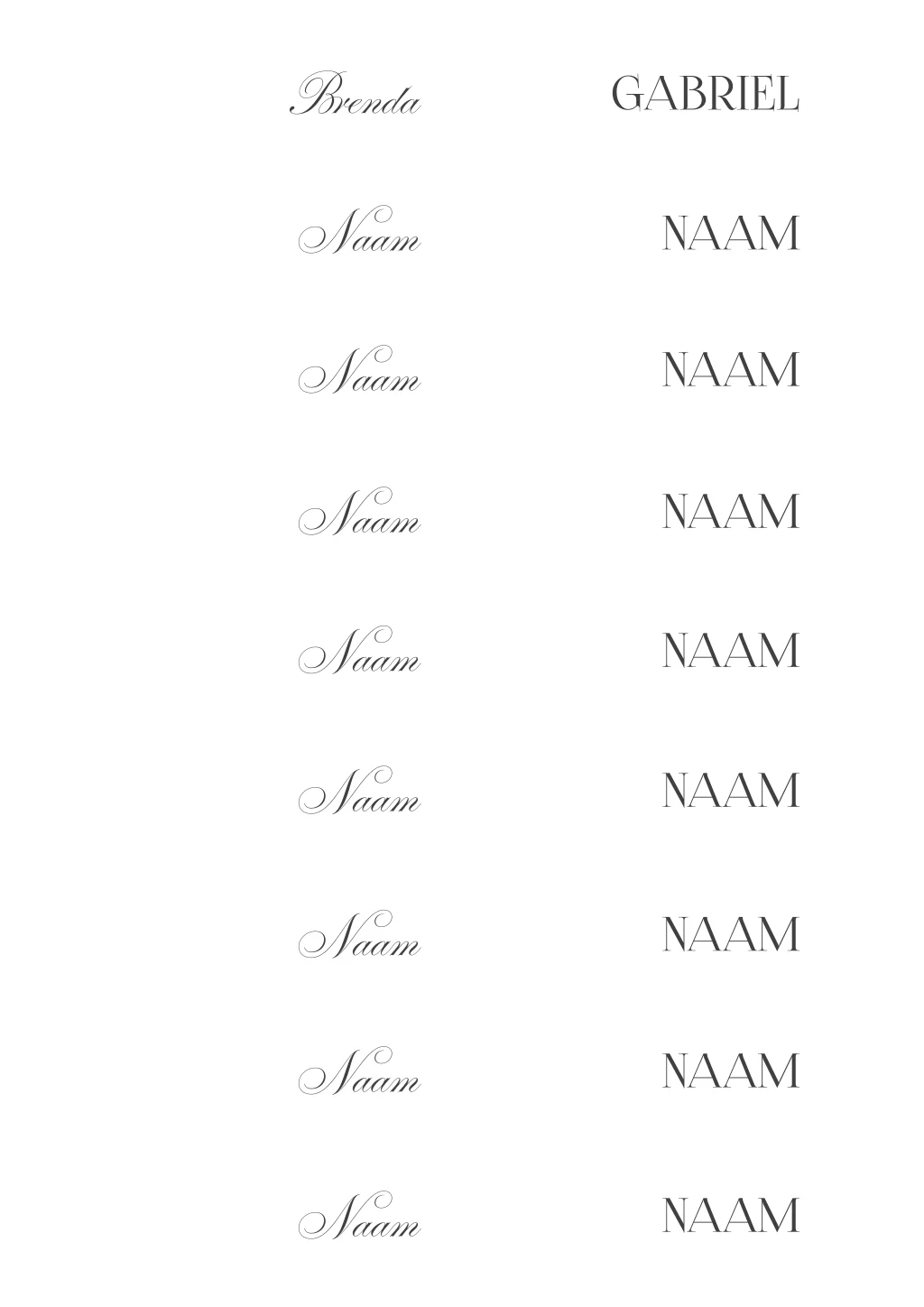 Bestel naamkaartjes zodat jullie gasten weten waar ze mogen zitten. Dit zijn langwerpige naamkaartjes in klassieke stijl. Vul in de editor zelf de namen in. Maak deze naamkaartjes bruiloft met een paperclip vast aan de trouwkaart.