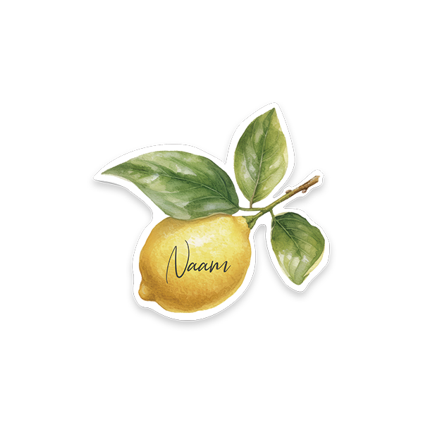 Ontwerp naamkaartjes voor de bruiloft. Dit zijn naamkaartjes in de vorm van citroentjes. In de editor pas je eenvoudig de namen aan.
