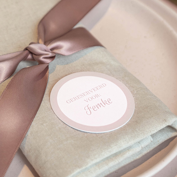 Ontwerp naamkaartjes in ronde vorm met een roze rand. Deze romantische naamkaartjes passen bij een roze trouwkaart in dezelfde stijl. Leg deze naamkaartjes op tafel tijdens het bruiloftsdiner.