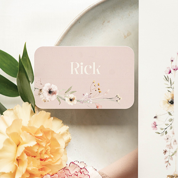 Maak bijpassende naamkaartjes voor de bruiloft met bloemetjes en hoogglans. Je kunt in de kaartopmaker alle namen invoeren. Deze tafelkaartjes passen bij een trouwkaart in dezelfde stijl.