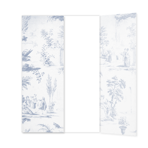 Bestel een omslag van kalkpapier, deze vouw je om de trouwkaart. Dit is een omslag met Toile de Jouy in blauwe tinten, passend bij een trouwkaart in dezelfde stijl.| Totaalprijs: 0 |