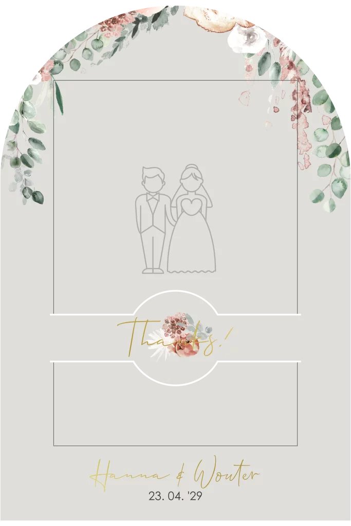 Ontwerp een bedankkaart waar je een foto van de bruiloft in kan steken. Dit is een kaart in boogvorm met bloemen en goudfolie.Totaalprijs: 0 |