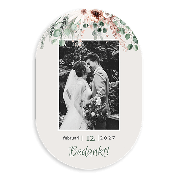 Maak een liefdevolle bedankkaart om de gasten te bedanken voor hun bijdrage aan jullie bruiloft. Dit is een bohemian trouwkaart in originele vorm met een foto van jullie. Je upload eenvoudig een foto in de kaartopmaker.