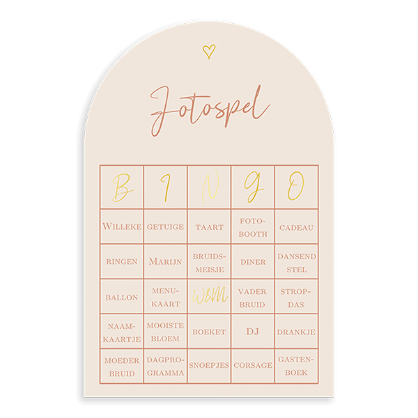 Zijn er veel kinderen op jullie bruiloft? Dit bingospel zorgt ervoor dat de kinderen iets te doen hebben. Laat de kinderen de voorwerpen zoeken en er een foto van maken. Op de achterkant van het kaartje staan de spelregels. In de editor pas je eenvoudig de voorwerpen aan naar wens.