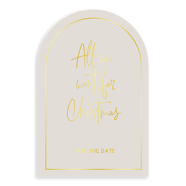 Een beige Save the Date kerstkaart in boogvorm. Op de voorkant wordt goudfolie gedrukt. Je kunt de teksten aanpassen en daarna een proefdruk bestellen.