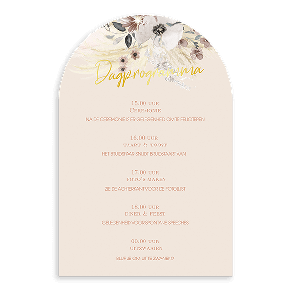 Ontwerp een dagprogramma bruiloft in boogvorm. Dit is een romantisch dagprogramma kaartje met bloemen en goudfolie. Je deelt dit programmakaartje uit op de trouwdag aan de daggasten.| Totaalprijs: 0 |
