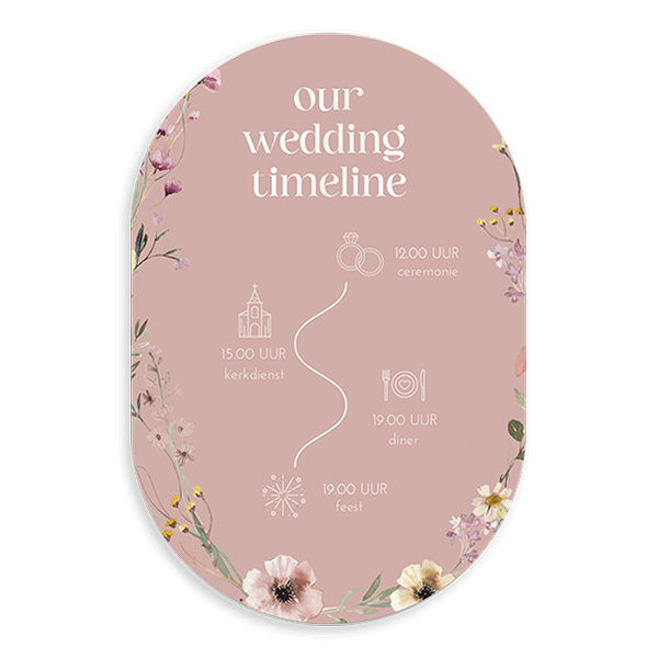 Deel dit romantische programmakaartje uit aan daggasten op de trouwdag. Dit is een ovaal kaartje met bloemen en icoontjes.