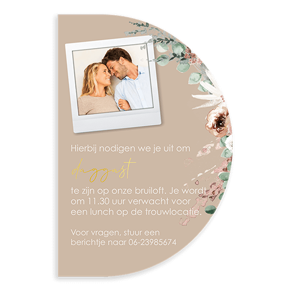 Ontwerp een extra kaartje bij je trouwkaart voor daggasten. Dit is een romantisch kaartje in boogvorm met bloemen en een foto. In editor upload je eenvoudig een persoonlijke foto.