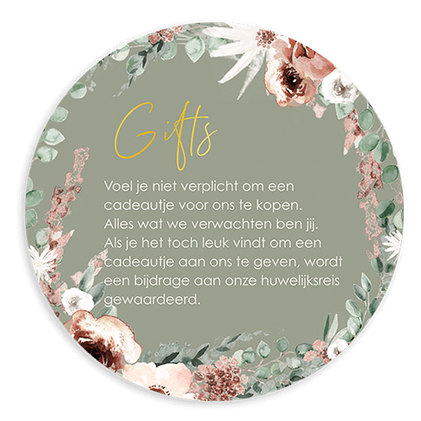 Maak een romantisch extra kaartje bij je trouwkaart. Op een extra kaartje noteer je extra informatie. Dit is een rond kaartje met bloemen en goudfolie.| Totaalprijs: 0 |