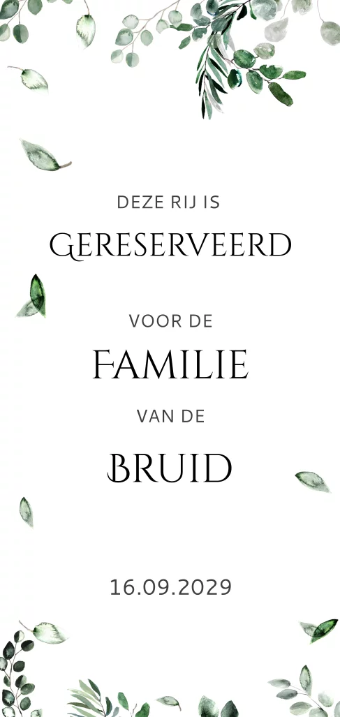 Wil je stoelen reserveren voor gasten? Ontwerp dan een gereserveerd kaartje. Dit is een botanisch kaartje met eucalyptus blaadjes. In de editor pas je eenvoudig de teksten aan.