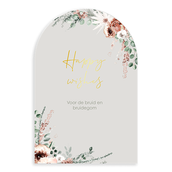 Ontwerp een romantisch invulkaartje in originele boogvorm. Op dit kaartje laat je gasten een lieve wens schrijf op vragen beantwoorden. Op het kaartje wordt goudfolie gedrukt.