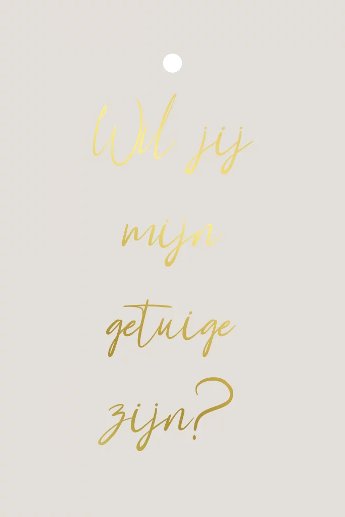 Ontwerp een label om getuigen te vragen. Dit is een rechthoekige label met tekst in goudfolie. Dankzij het gaatje bindt je het labeltje gemakkelijk vast aan een kadootje. Zo vraag je op een originele manier bruiloft getuigen.