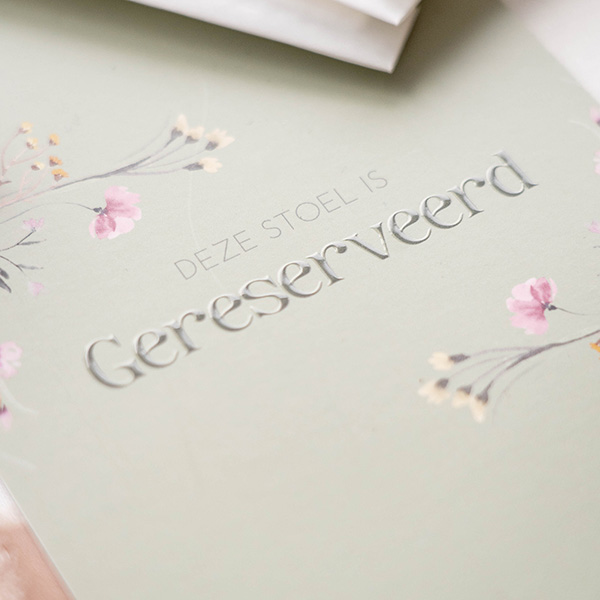 Maak een kleurrijk gereserveerd kaartje met bloemetjes en de tekst in hoogglans. Dankzij gaatjes kan je de kaartjes handig ophangen aan de stoelen.