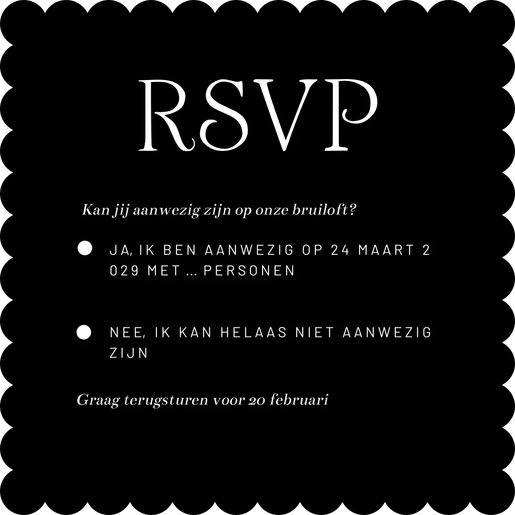 Bestel dit vierkante rsvp-kaartje met boogjes bij jullie trouwkaart als jullie graag willen weten van de genodigden of ze wel of niet kunnen komen. Vraag aan de gasten of ze dit kaartje met antwoord terug sturen naar jullie.