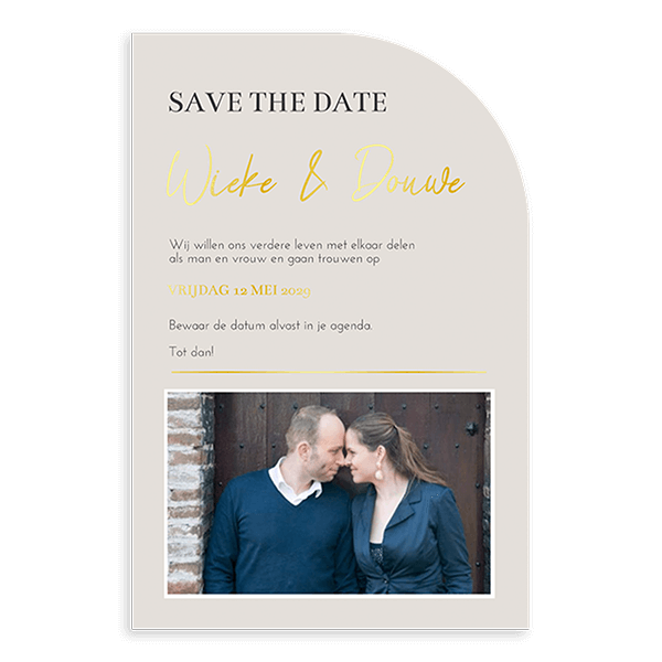 Een mooie Save the Date kaart met foto en goudfolie in een bijzondere vorm. De bijzondere vorm van deze kaart kan worden aangepast door contact met ons op te nemen.