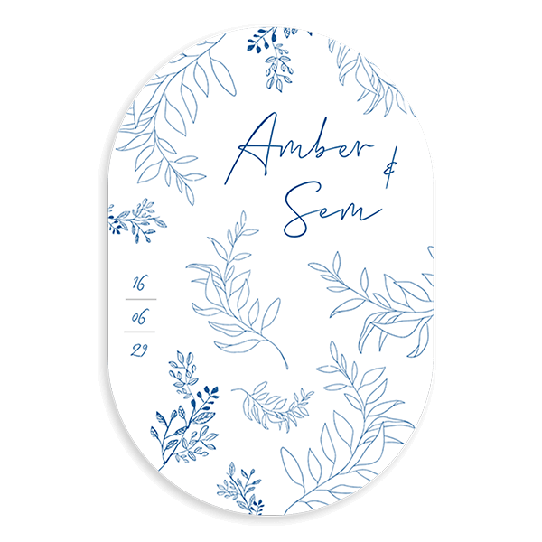 Maak een romantische trouwuitnodiging met blauwe bloemen en blaadjes. Dit is een uitnodiging voor de trouwdag in originele, ovale vorm. In de editor pas je eenvoudig de teksten en kleuren aan.