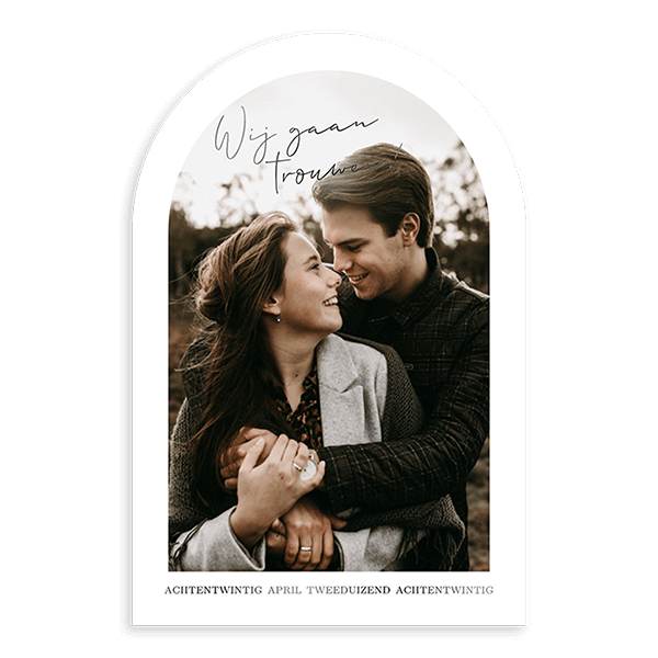 Deze trouwkaart heeft een leuke boogvorm. Je kunt eenvoudig je eigen foto uploaden. De teksten worden met zwartfolie gedrukt waardoor je een chique glimlaag over de tekst krijgt. Je kunt ook een andere kleur folie kiezen.