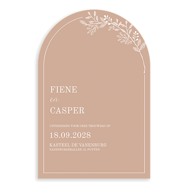 Kies deze originele trouw uitnodiging om een complete set mee te maken. Laat de kleur en het takje terug komen op alle drukwerk voor jullie bruiloft. Zo creëer je eenheid.| Totaalprijs: 0 |
