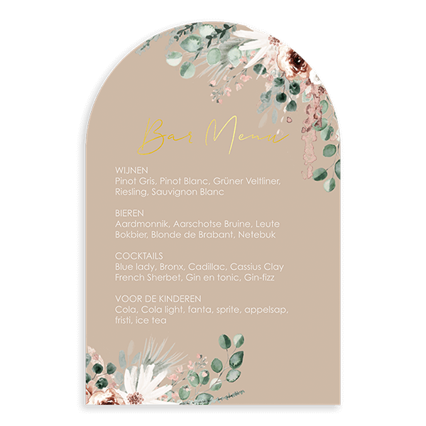 Een romantisch bordje met bloemen en goudfolie voor jullie om bij het buffet te zetten tijdens het bruiloftsdiner.| Totaalprijs: 0 |