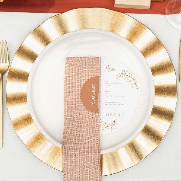 Een originele menukaart met roséfolie en takjes om zelf te maken. Deze menukaart hoort bij een trouwkaart. Dit is een bijzondere kaart door zijn vorm. Neem contact met ons op als je een andere vorm menukaart zou willen hebben.| Totaalprijs: 0 |