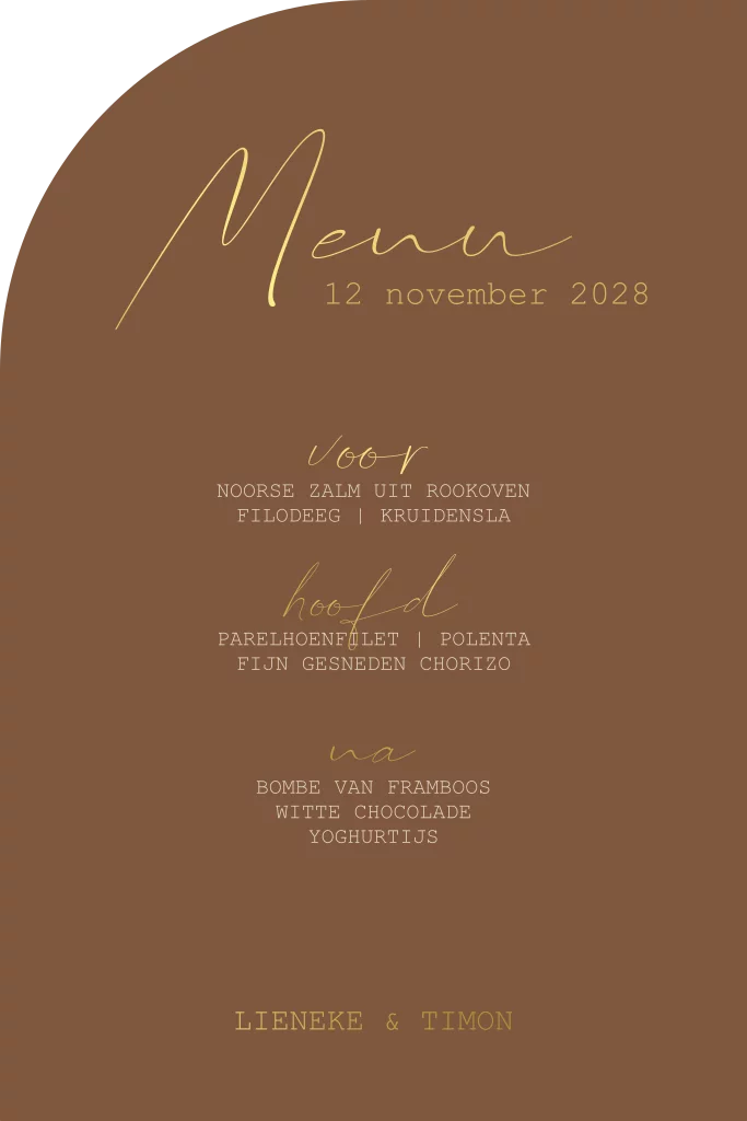 Ontwerp een stijlvolle menukaart in originele vorm voor op je trouwerij. Deze menukaart heeft een warme bruine tint en er wordt goudfolie op gedrukt. De menukaart hoort bij deze trrouwkaart.