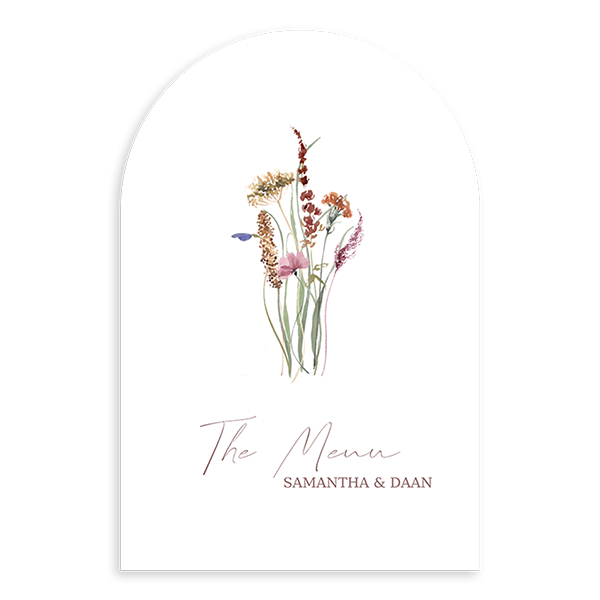Ontwerp een bruiloft menukaart met een bosje bloemen,. Dit is een bloemen menukaart in boogvorm. Op de achterkant voeg je eenvoudig jullie menu toe.