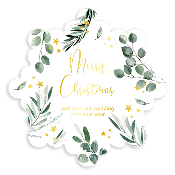 Een exclusieve Save the Date kerstkaart die genodigden in de kerstboom kunnen hangen dit jaar. Op de voorkant wordt goudfolie gedrukt. Kondig jullie trouwdatum aan met deze Save the Date.