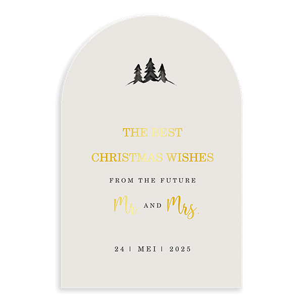 Een kerstkaart om te versturen als Save the Date met goudfolie. Op de achterkant zou je een foto kunnen uploaden. Alle teksten en kleuren zijn aan te passen in de kaartopmaker.