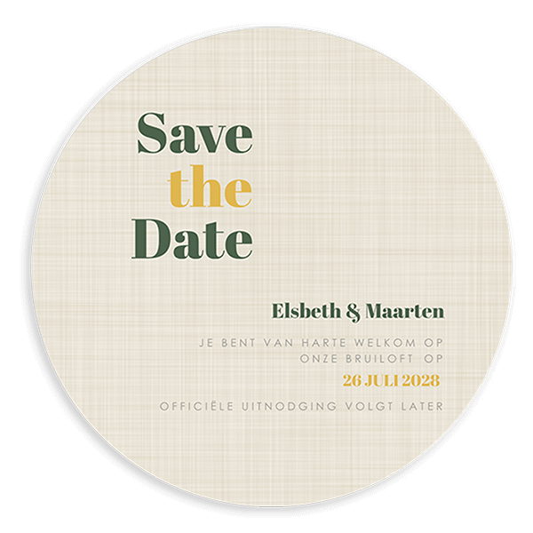 Maak een moderne Save the Date kaart in ronde vorm. De Save the Date heeft een linnen look op de achtergrond. Deze Save the Date heeft een bijpassende trouwkaart. Zo verstuur je alles in dezelfde stijl.