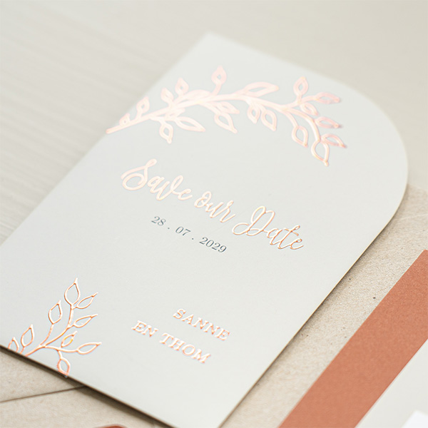 Stuur deze originele Save the Date kaart in deze leuke vorm. Er wordt glimmende roséfolie gedrukt op beide zijden. We hebben ook een bijpassende trouwkaart in dezelfde stijl.