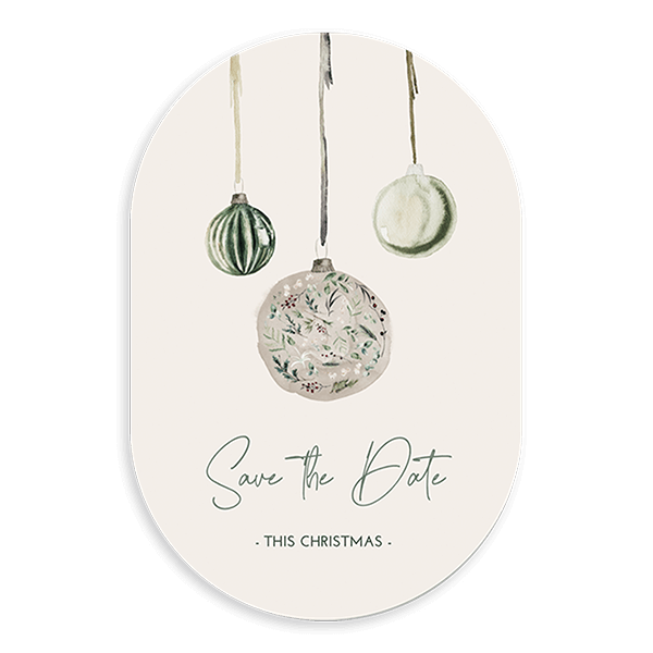 De groene kerstballen maken met elkaar een hele sfeervolle Save the Date kerstkaart. De kaart wordt in een ovale vorm gesneden. Zo maak je echt een Save the Date die niemand anders heeft.