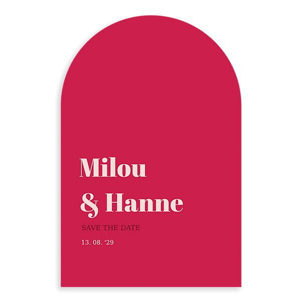 Ontwerp een moderne save the date kaart in felroze kleur. Deze Save the Date kaart heeft een boogvorm. De kaart past bij een trouwkaart in dezelfde stijl. Toch liever een andere kleur? De kleuren en teksten pas je eenvoudig aan in de editor.