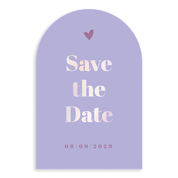 Deze Save the Date kaart in boogvorm heeft trendy paarse tinten. Op de voorkant wordt het woord SAVE THE DATE met holografisch folie gedrukt. Dit geeft een galaxy uitstraling in regenboogkleuren.