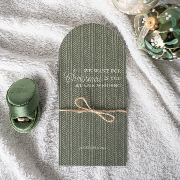 Maak een gezellige Save the Date kerstkaart in het groen om naar familie en vrienden te sturen deze kerst. Gebruik folie om een leuke glans aan jullie Save the Date toe te voegen. De achtergrond heeft een textuur van een gebreide trui. Als je een andere gebreide textuur, of een geheel andere textuur, is dit te vinden in de beeldbank. Tip: als je een leuke kleur voor jezelf uit wil kiezen voor de achtergrond kun je op Pinterest op ' winterkleuren' zoeken zodat je een kleur hebt die helemaal bij jullie past.