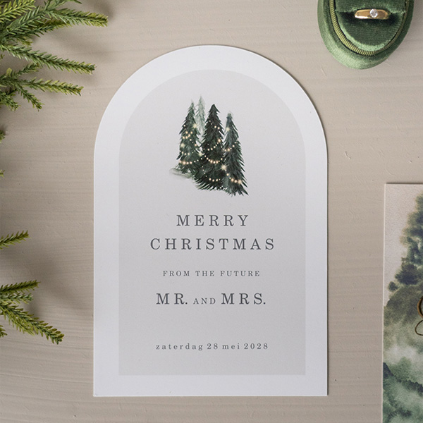 Een klassieke kerst Save the Date kaart in boogvorm. Met deze Save the Date kaart ben je uniek en stijlvol.