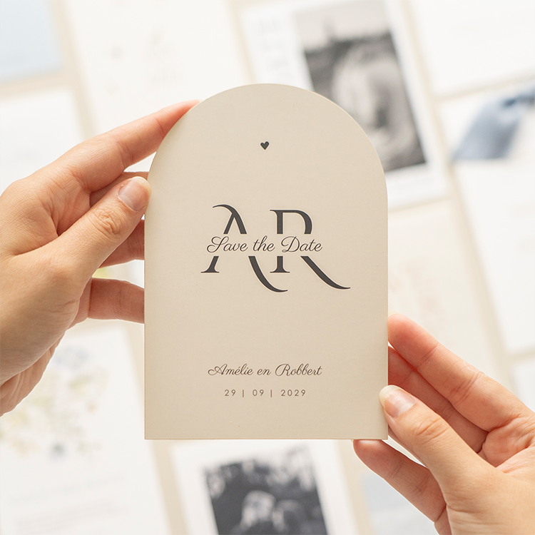 Ontwerp een klassieke Save the Date in boogvorm voor jou bruiloft. Deze Save the Date met logo stuur je om gasten op de hoogte te stellen van jullie trouwdatum.