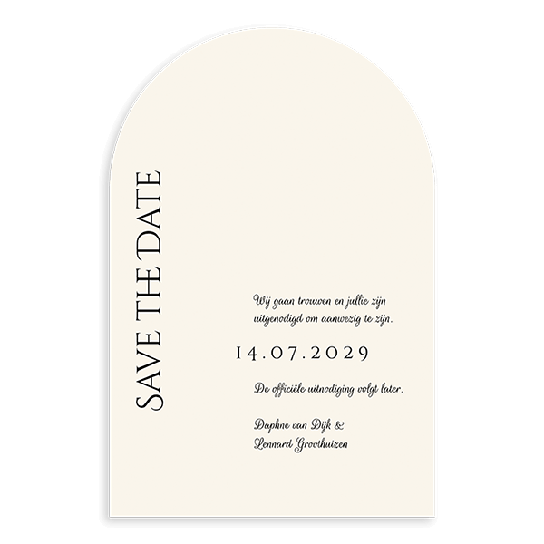 Een Save the Date verstuur je om bruiloftsgasten jullie trouwdatum bekend te maken. Dit is een moderne Save the Date in boogvorm. De kaart heeft een beige tint en het papier heeft een linnen look. Pas in de editor de teksten eenvoudig aan en maak een persoonlijke Save the Date.