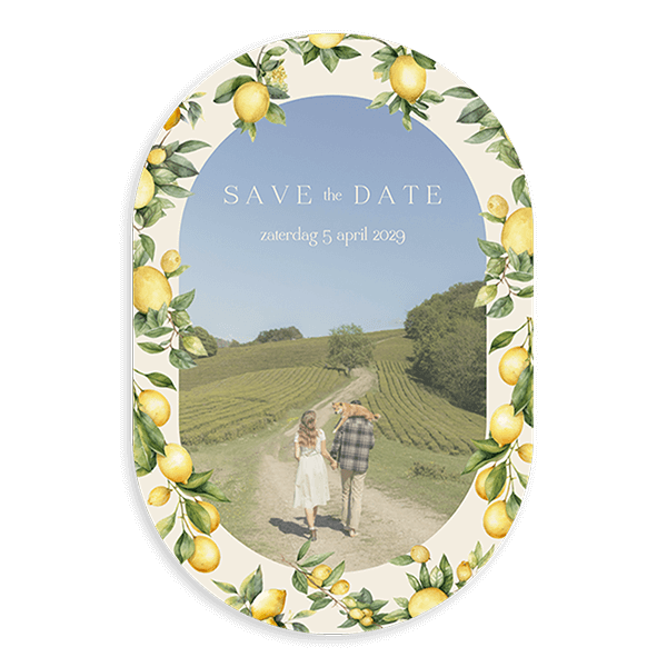 Deze ovale Save the Date met citroentjes en foto maakt deel uit van een trouwkaartenset.