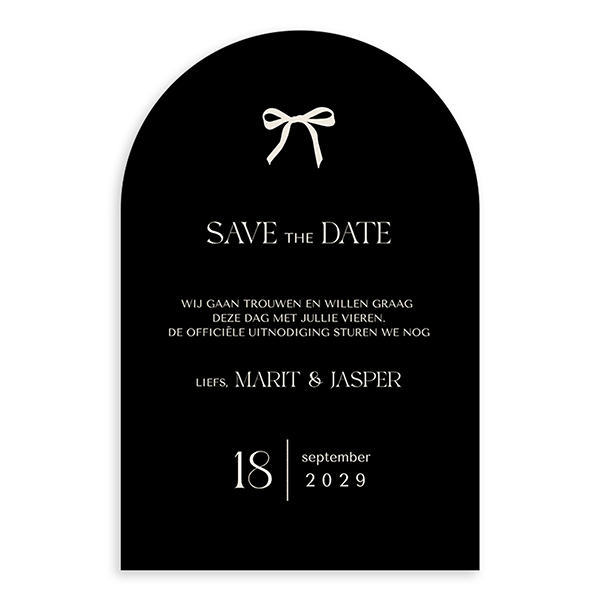 Bestel een Save the Date om gasten te informeren over de datum van jullie trouwdag. Dit is een stijlvolle Save the Date in boogvorm met een strikje.