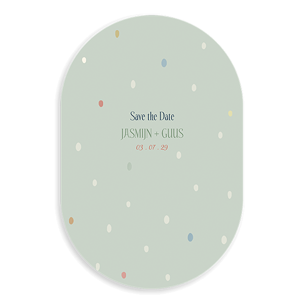Verstuur een trend Save the Date met stipjes. Deze kleurrijke Save the Date bestel je in een ovale vorm.