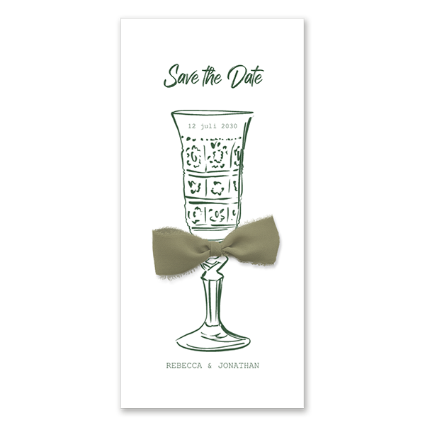 Ontwerp een vintage Save the Date in groene tinten. Dit is een Save the Date met vintage wijnglas. In de kaart zitten twee gaatjes, door deze gaatjes strik je een lint. Zo verstuur je een originele Save the Date kaart. hier vindt je onze collectie linten en strikken.