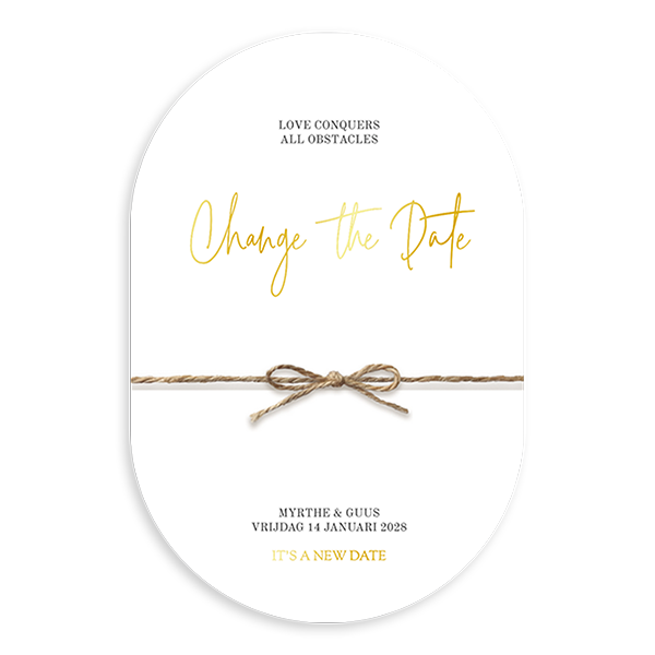 Een stijlvol Change the Date kaartje met goudfolie op de voorkant en een touwtje. Deze kaart heeft een bijzondere vorm.