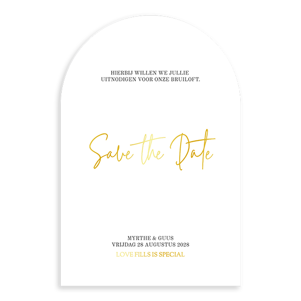 Stijlvolle Save the Date kaart met goudfolie en bijzondere vorm