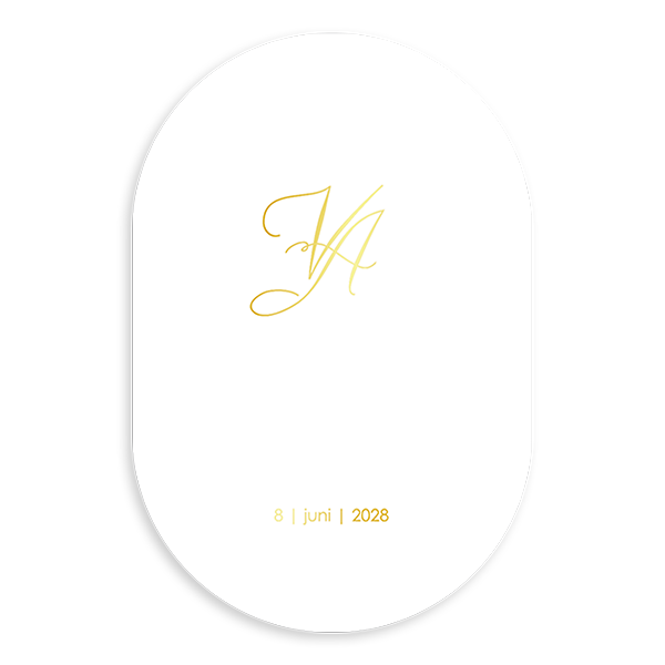 Een klassieke trouwkaart in een ovale vorm. Op de voorkant maak je een logo met jullie eigen initialen. Deze worden in goudfolie gedrukt. Je kunt ook een andere kleur folie kiezen.