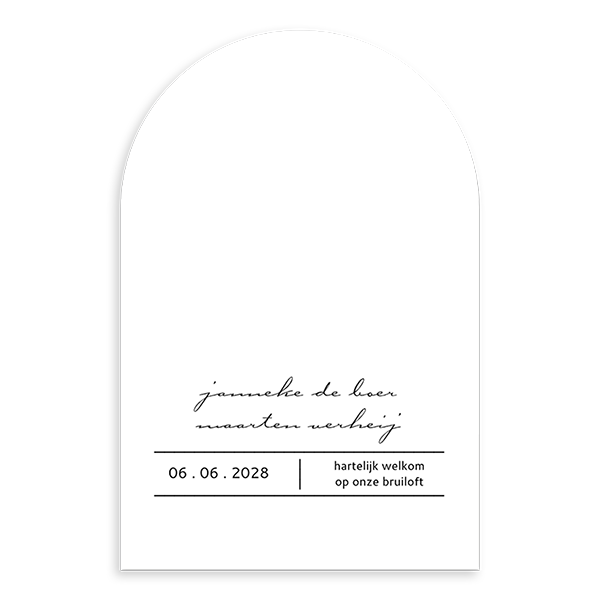 Kies voor deze moderne trouwkaart in een boogvorm. De teksten zijn zorgvuldig gekozen om een moderne uitstraling te geven. Je kunt andere lettertypes uitkiezen en de kleuren aanpassen. Zo maak je altijd een stijlvolle en unieke trouwkaart. Bijpassende kaarten mogelijk.