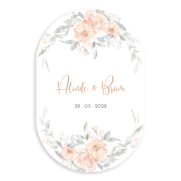 Een romantische trouwkaart in de vorm van een ovaal. Met peach kleurige bloemen die passen bij een styling in pastel tinten voor de bruiloft.| Totaalprijs: 0 |