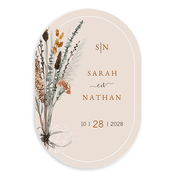 Een ovale trouwkaart die past bij een warme en sfeervolle herfst bruiloft. De warme tinten komen op de achterkant ook terug. Met deze trouwkaart maak je een uitnodiging die past bij de herfst.