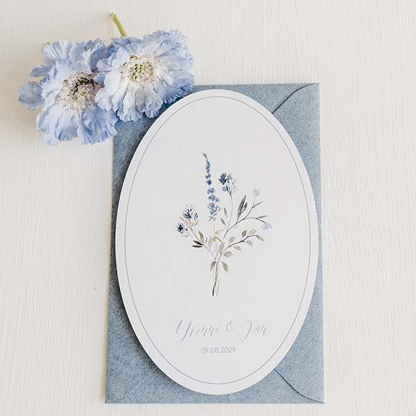 Ontwerp een romantische trouwkaart met blauwe bloemen. Dit is een trouwuitnodiging in ovale vorm.| Totaalprijs: 0 |
