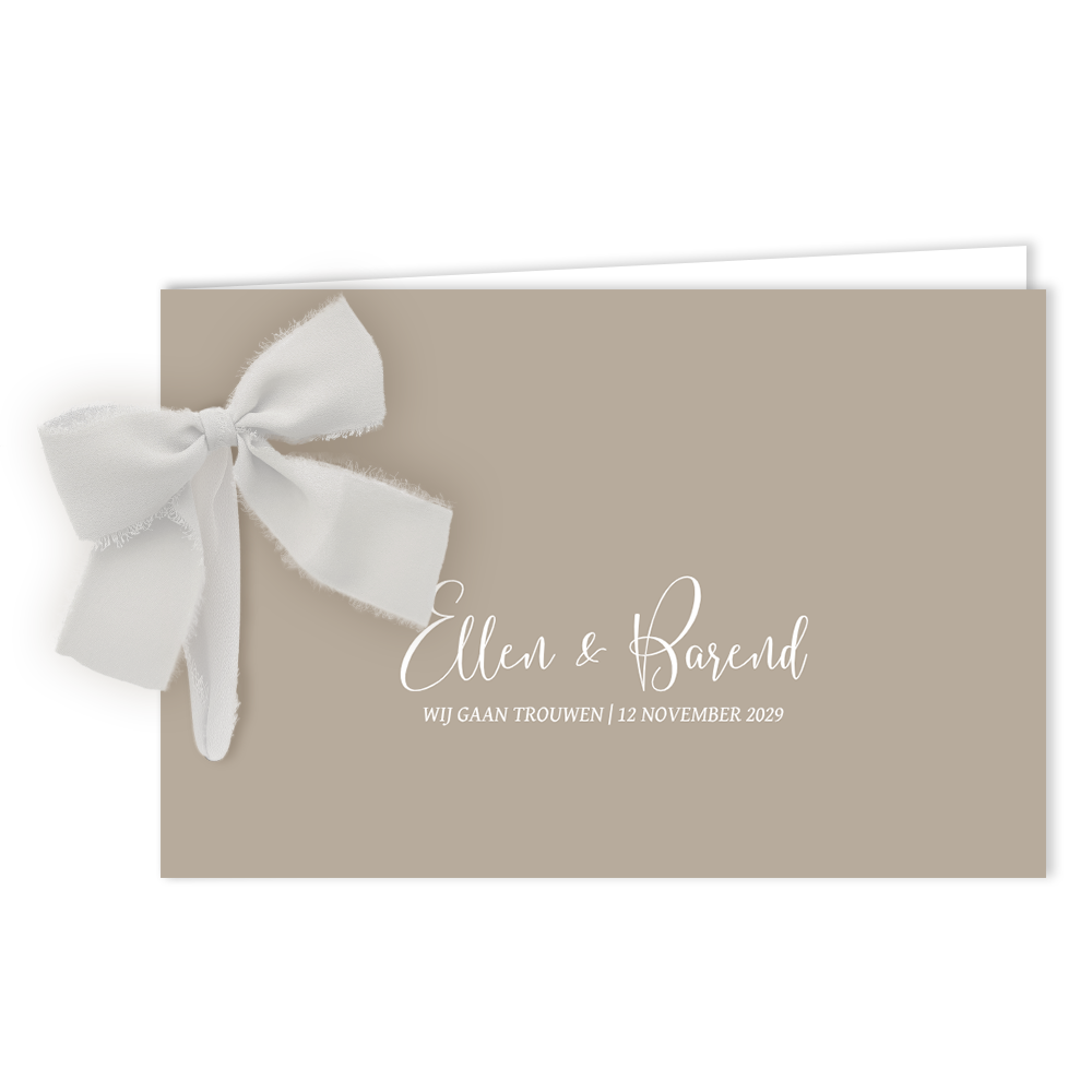 Stijlvolle trouwkaart in taupe met lint en icoontjes